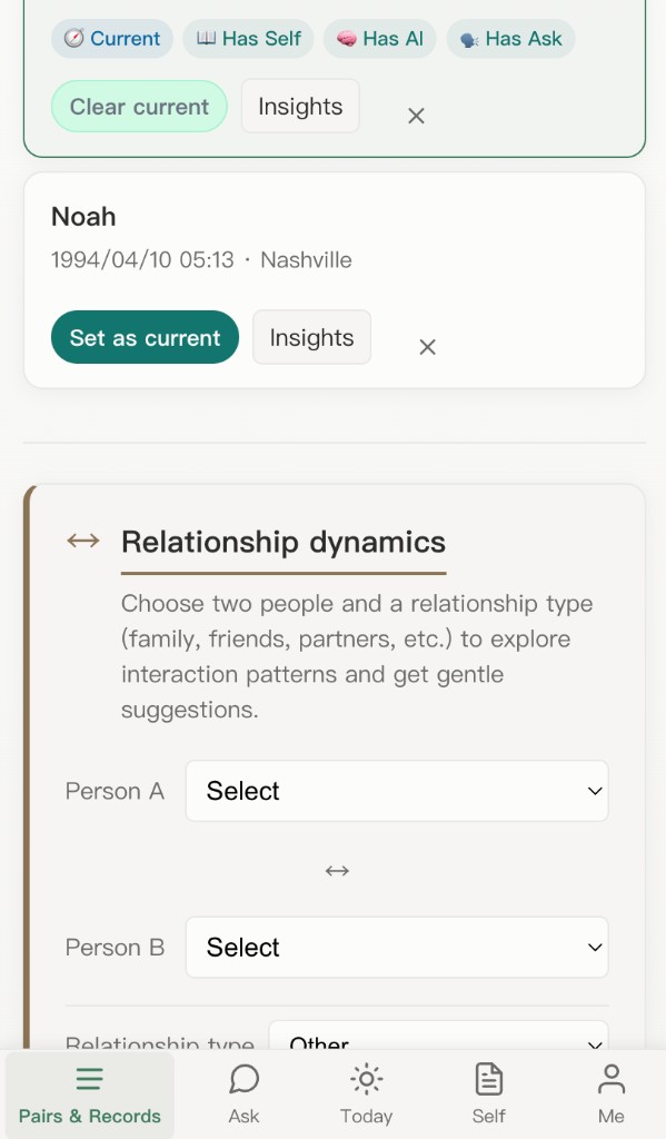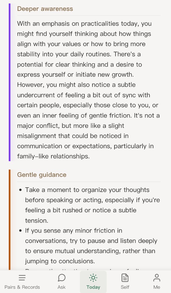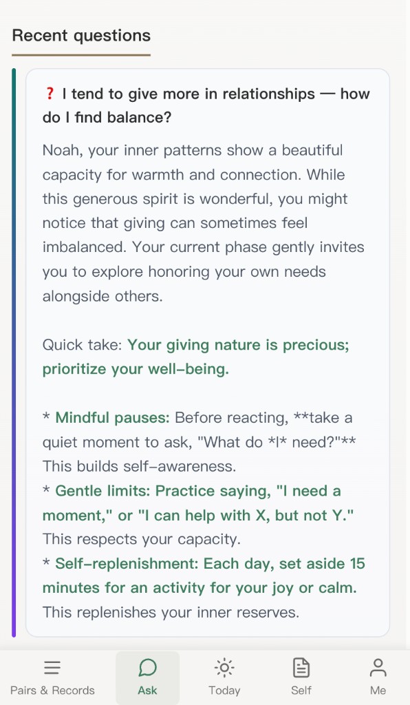 Users receive personalized insights, daily reflection prompts, and long‑form guidance that help them notice patterns in their relationships, work, and inner life — so they can make calmer, more intentional choices.
