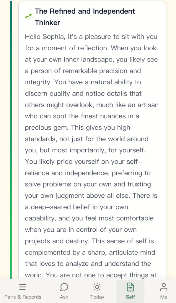 - Long‑form guidance — For deeper work, users can unlock longer self‑awareness reports and thematic explorations.